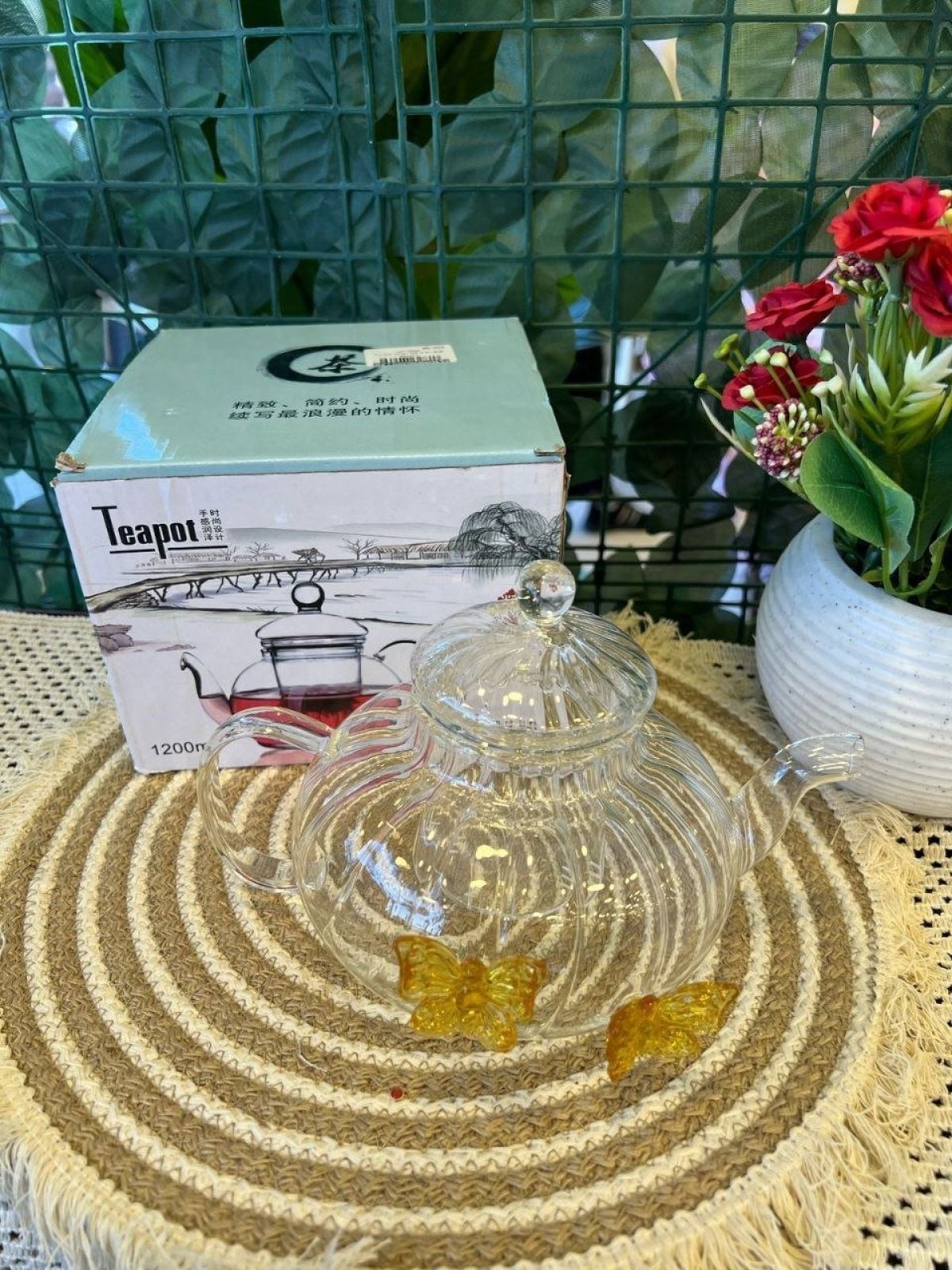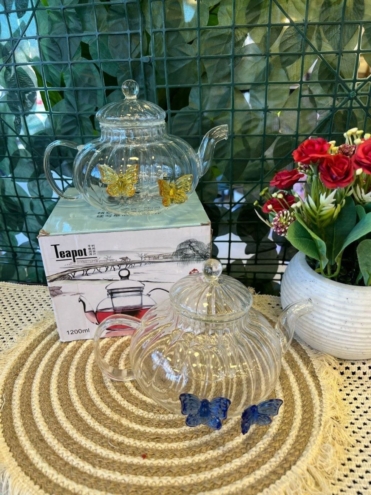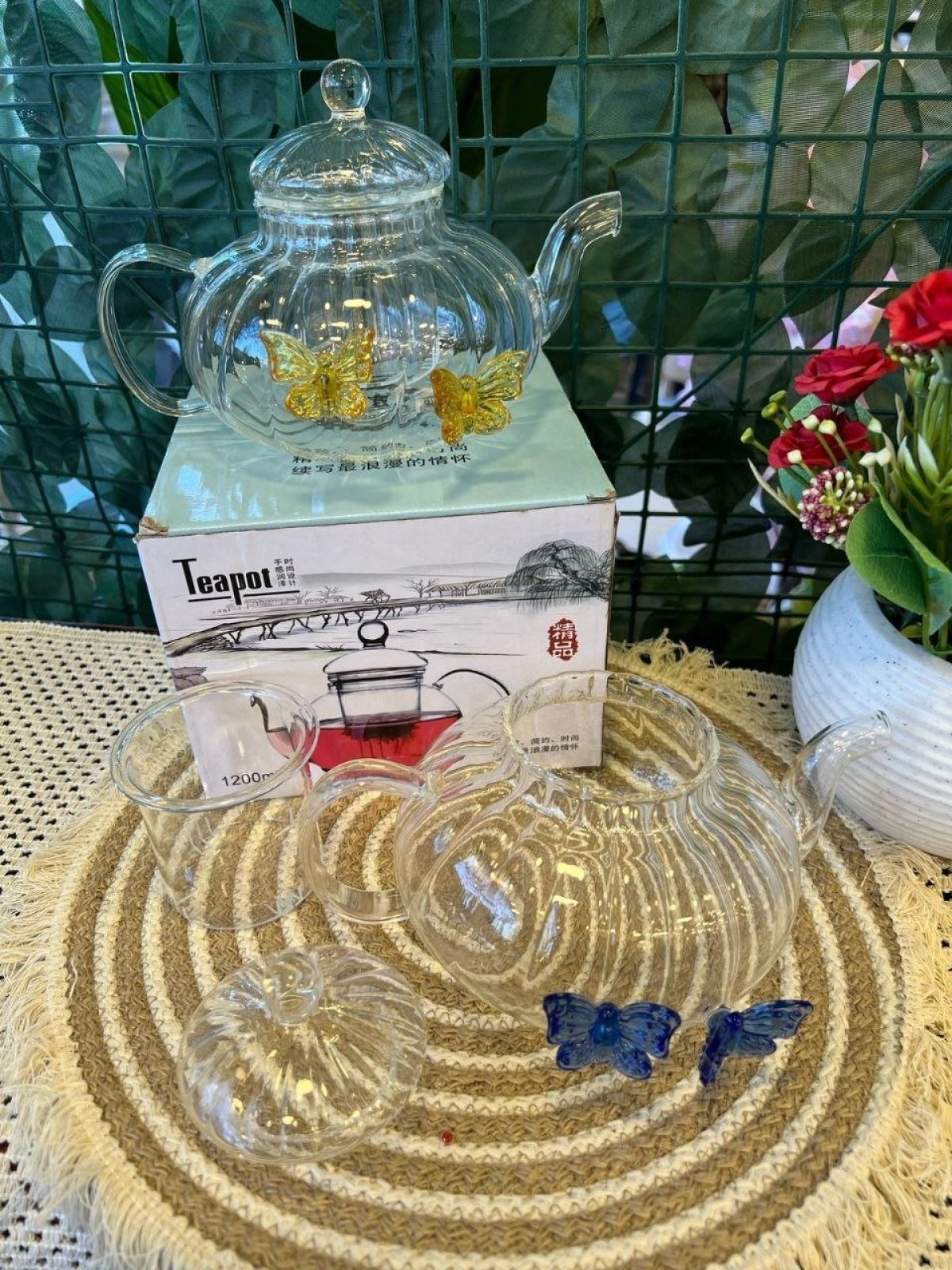 تصميم فريد وجميل بشكل فراشة، هيضيف لمسة روعه علي سفرتك علي الفطار. - جواه مصفى زجاجي لفلتر الشاي بشكل مثالي. - غطاء زجاجي محكم يحفظ الحرارة ويزيد من نقاء الشاي. - مصمم من بايركس عشان يكون مقاوم للحرارة وسهل في التنظيف