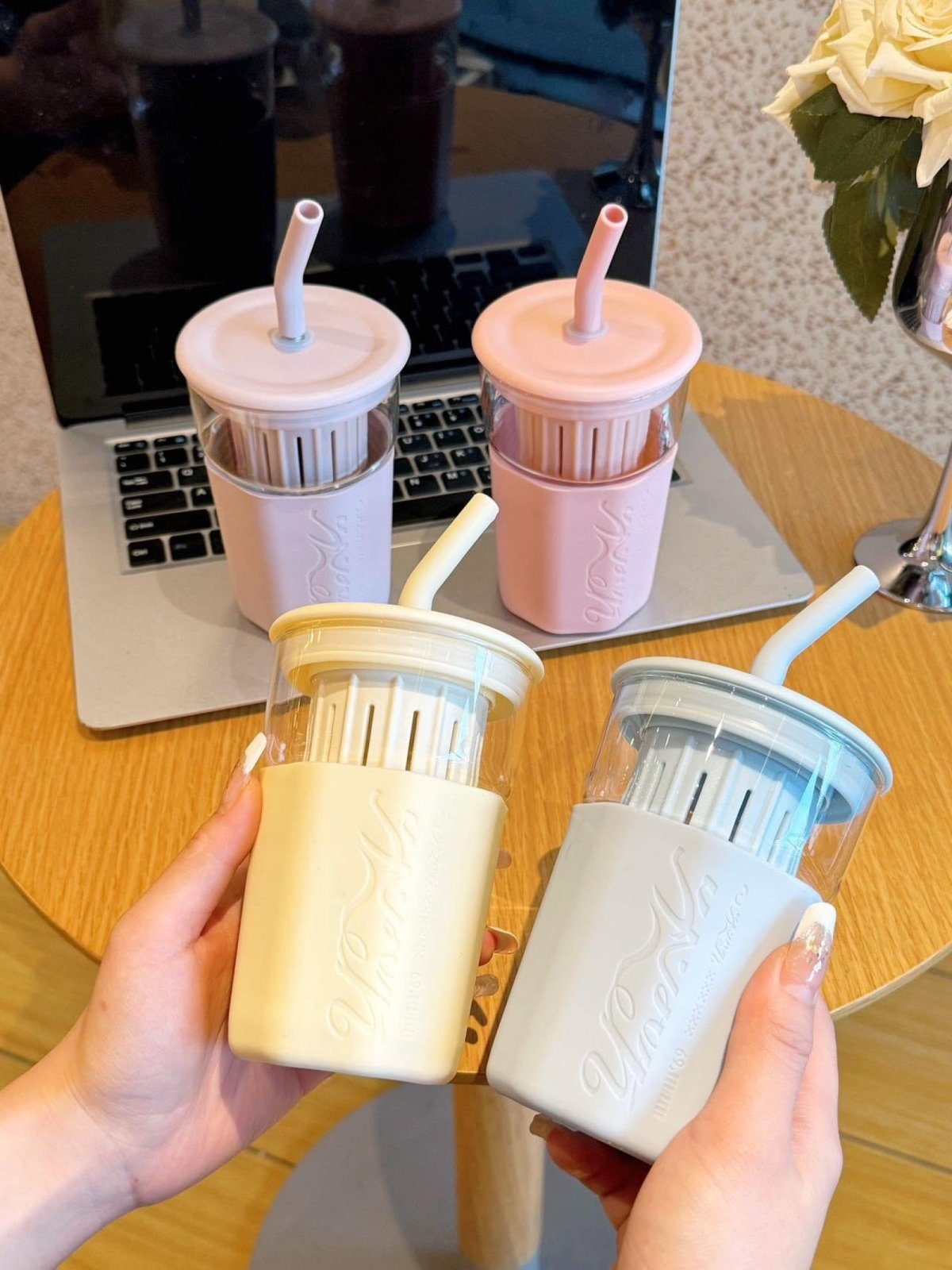 مج زجاج بصفايه بلاستيك وشاليموه استانلس في سيليكون🤍 مناسب للمشروبات البارده 🤍