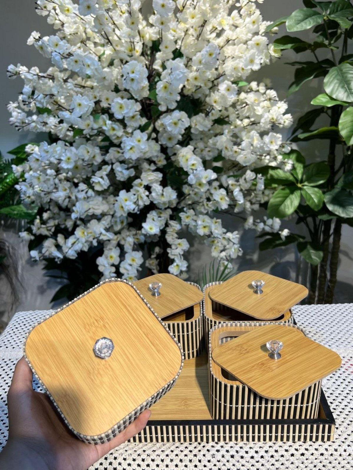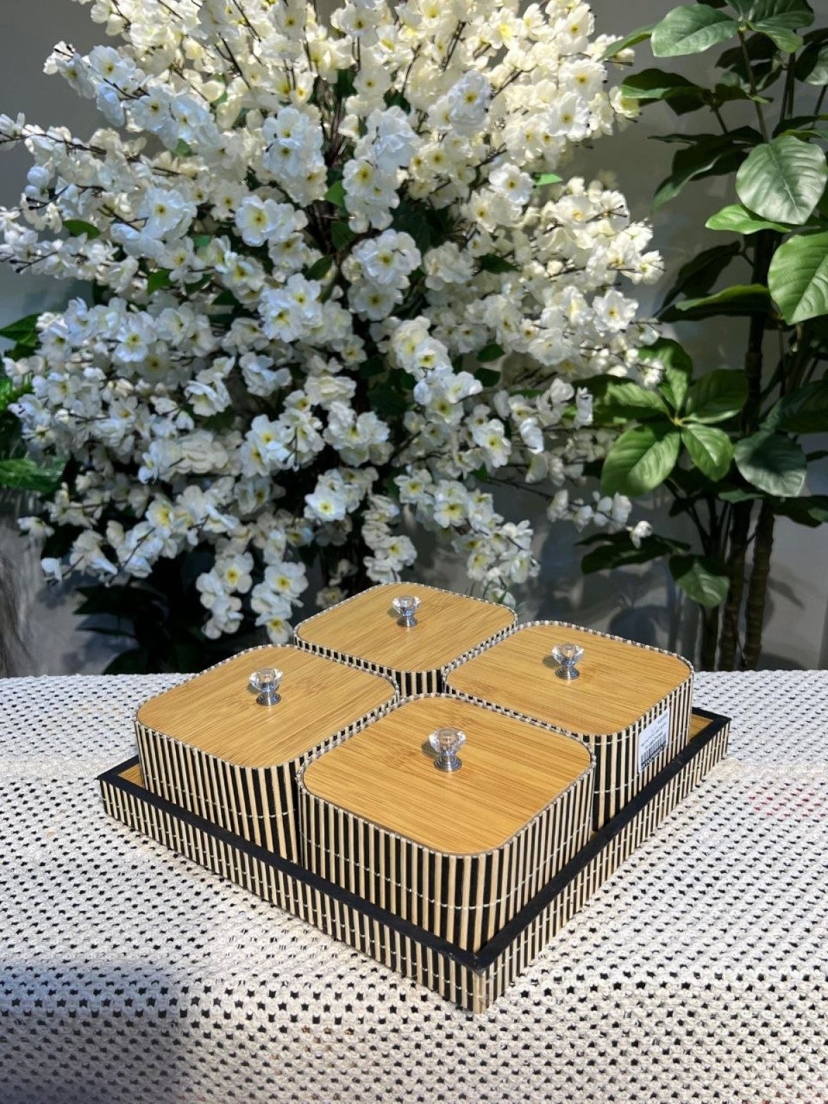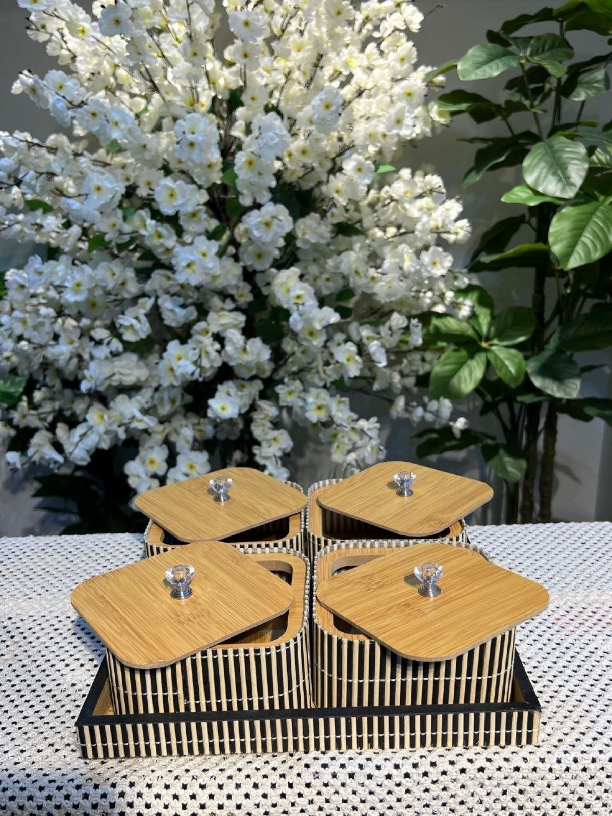 طقم تسالي مكون من 5قطع،صينيه خشب بامبو مع 4 اطباق تسالي بغطاء كريستال، شكلهم شيك جدًا ومناسبين كمان للكاندي 🤍