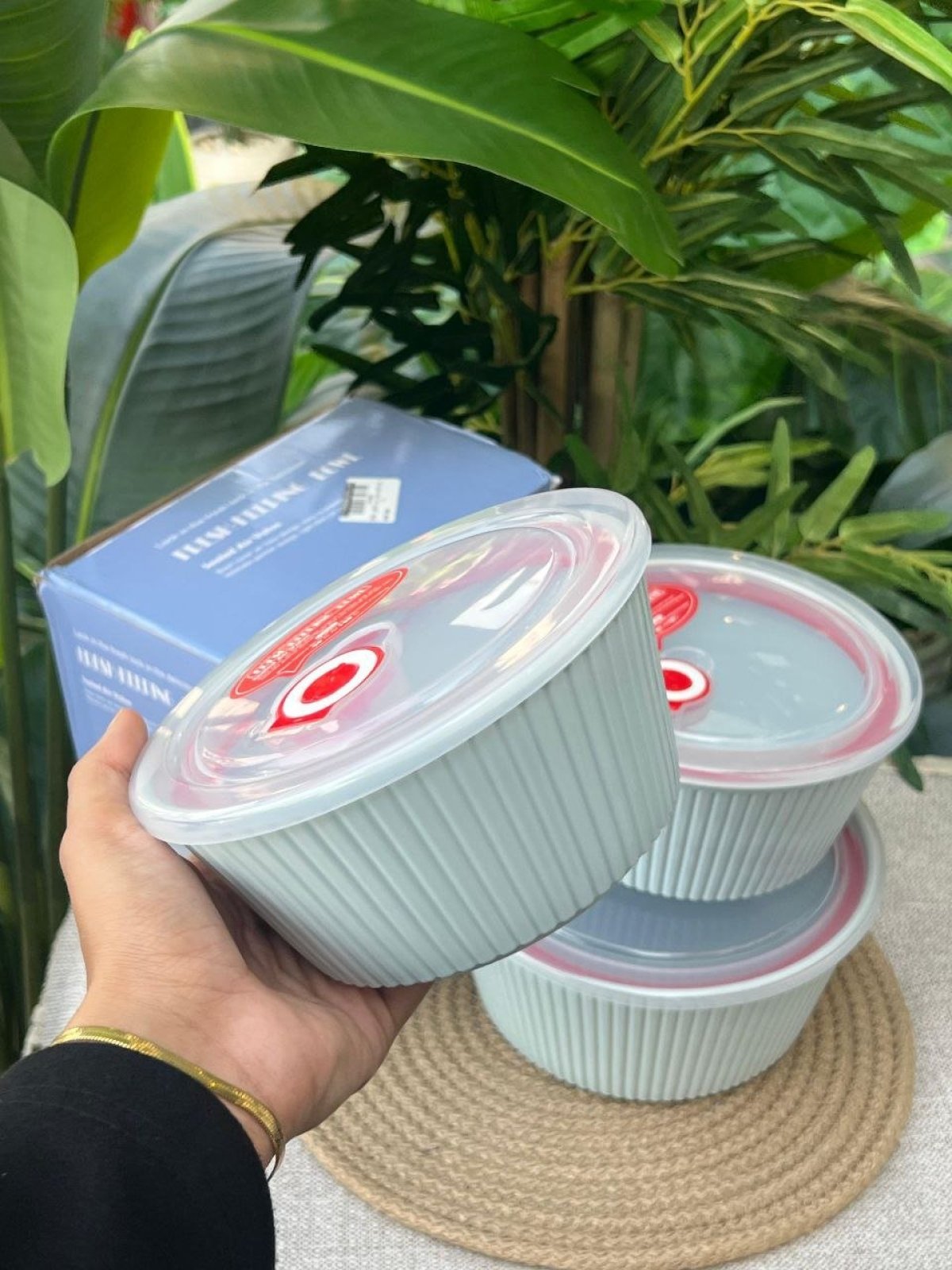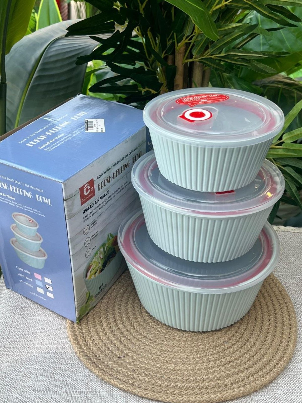 3 مقاسات مختلفة - بغطاء محكم ومعاه فتحة تهوية - عملي لتخزين بواقي الأكل والخضار والفواكه - خامة آمنة وسهلة التنضيف