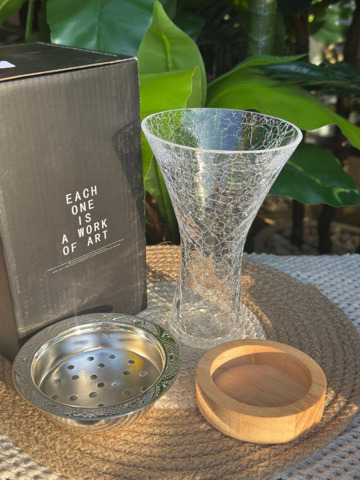 - تصميم راقي يجمع بين الزجاج، الاستانلس، والخشب - شكل شيك جدًا ومثالي للديكور والاستخدام اليومي - كوستر خشب يضيف لمسة فخمة ويحافظ على السطح