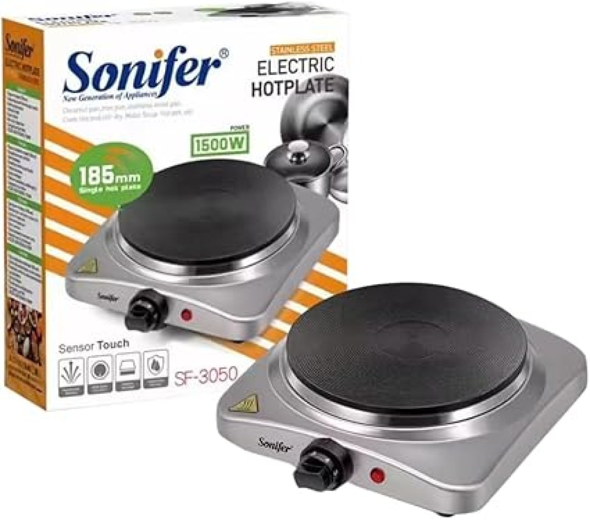هذا المنتج هو بوتاجاز كهربائي من العلامة التجارية سونيفر، موديل SF-3058. . الطاقة: يعمل بقدرة 1500 وات. سطح الطهي: يتميز بسطح تسخين بقطر 18.5 سم. المادة: مصنوع من الفولاذ المقاوم للصدأ (ستانلس ستيل). المميزات: يحتوي على مقبض للتحكم في درجة الحرارة، ضوء مؤشر للتشغيل، وأقدام غير قابلة للانزلاق...