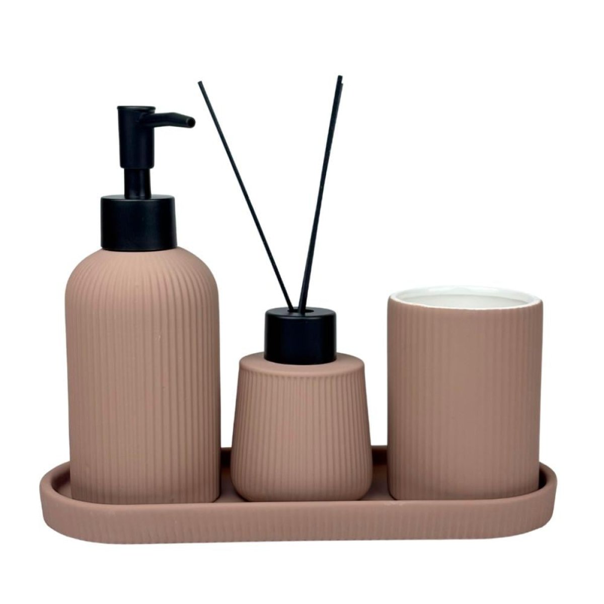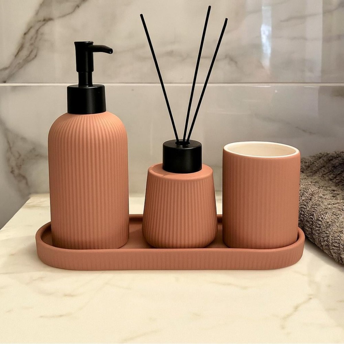 طقم إكسسوارات حمام بتصميم عصري مكون من موزع صابون، حامل لفرش الأسنان، وموزع عطر، مع صينية تنظيم.