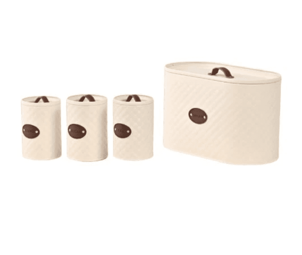 مجموعة علب تخزين للمطبخ (طقم علب سكر، شاي، قهوة، وعلبة خبز) باللون الابيض ومقابض خشبية.