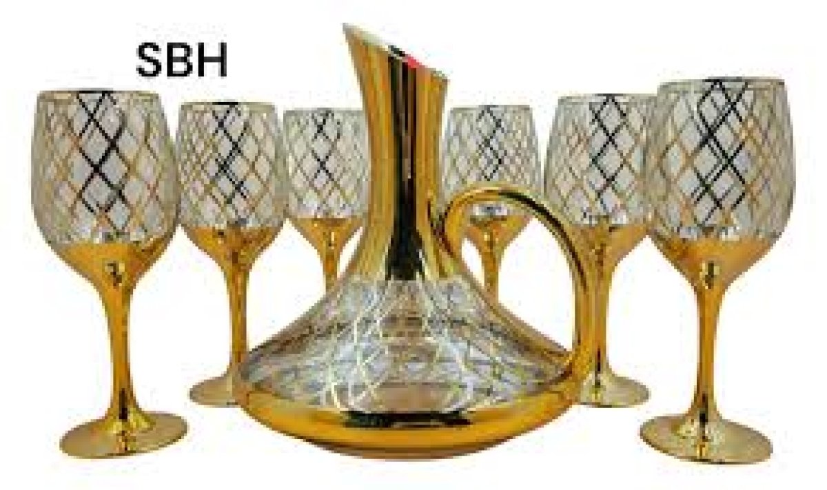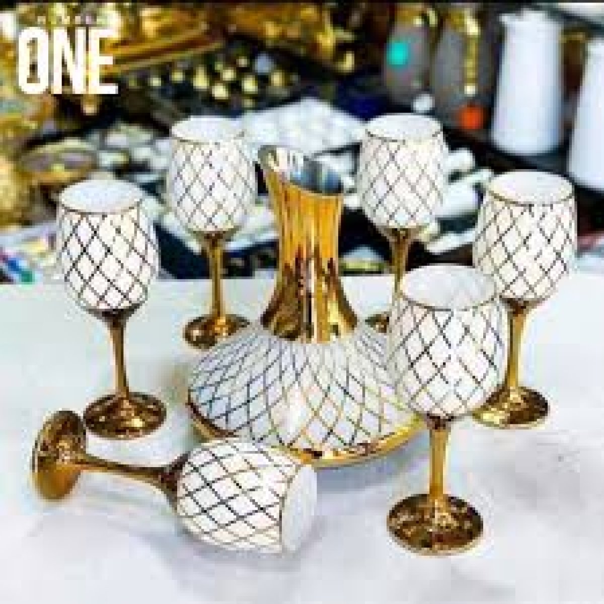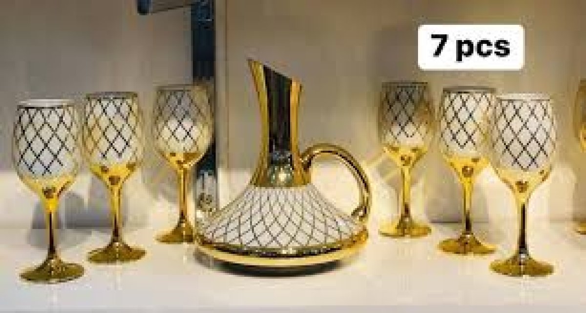 أضف لمسة من الرقي والفخامة إلى مائدتك مع هذا الطقم المذهل المكون من 7 قطع. يتضمن الطقم 6 كاسات زجاجية بتصميم أنيق مزخرف بنمط شبكي ذهبي وقاعدة ذهبية، بالإضافة إلى وعاء تقديم كبير أو إبريق بنفس التصميم الذهبي الفاخر. مثالي لتقديم العصائر، المشروبات، أو حتى كقطع ديكورية فاخرة في مناسباتك الخاصة وحفلاتك.