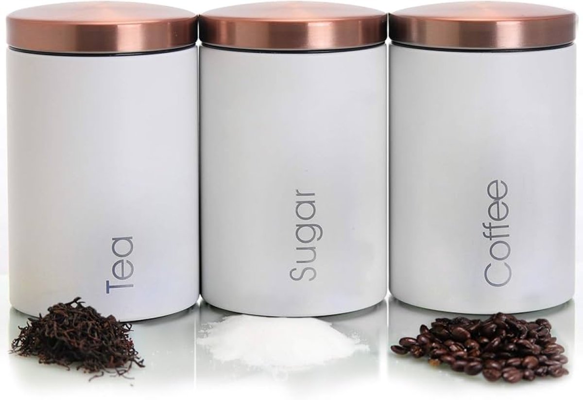 سهولة التعرف على المحتويات: تتميز كل علبة بتسمية واضحة (شاي، سكر، قهوة) بخط أنيق وعصري، مما يضيف لمسة مميزة ويسهل عليك العثور على ما تبحث عنه.