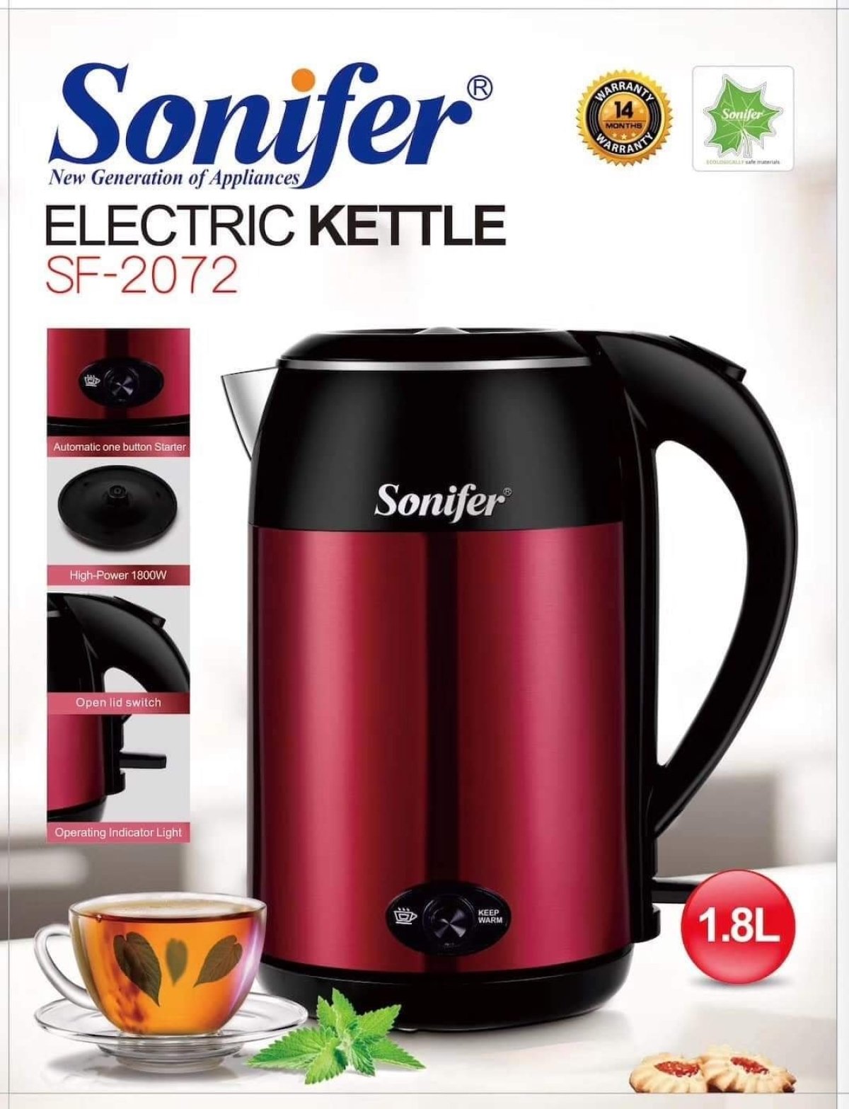 هذا المنتج هو غلاية كهربائية سونيفير (Sonifer) موديل SF-2072. . السعة: 1.8 لتر. القوة: 1800 واط. المادة: ستانلس ستيل SUS304. المميزات: تتميز بخاصية الحفاظ على السخونة (Warm)، وقاعدة دوارة 360 درجة.