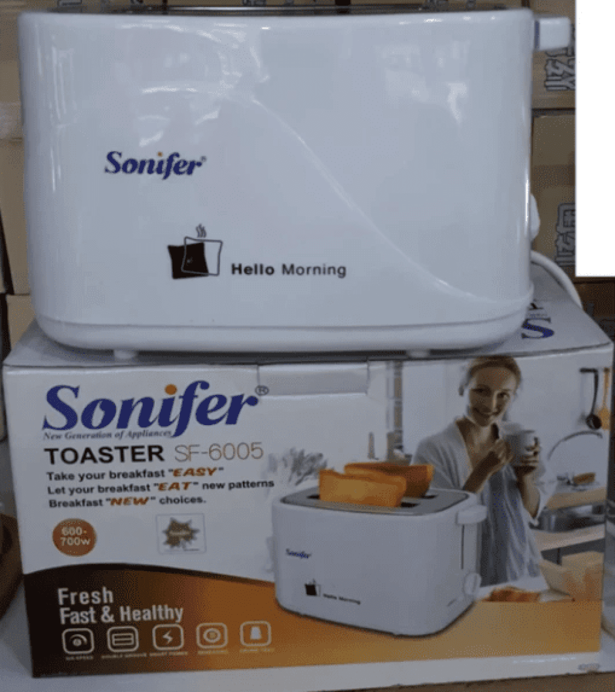 هذا المنتج هو محمصة خبز كهربائية من ماركة سونيفر (Sonifer)، طراز SF-6005. . القدرة الكهربائية: تعمل بقوة 700 وات. المميزات: تحتوي على صينية فتات قابلة للإزالة وتحكم متغير في درجة التحمير. التصميم: هيكل بلاستيكي أبيض مع وظيفة الإخراج التلقائي للخبز.
